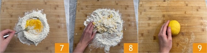 Commencez à incorporer les œufs à la farine avec une fourchette 7, puis continuez à la main 8 en pétrissant la pâte pendant au moins 10 minutes. Lorsqu'elle sera lisse et compacte 9, couvrez-la avec du film alimentaire et laissez-la reposer pendant une demi-heure à température ambiante.