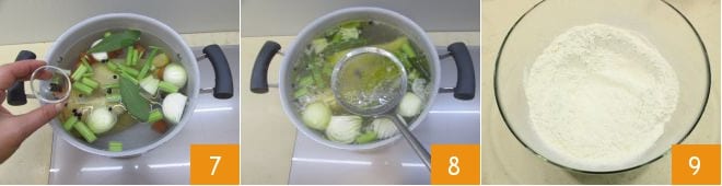 Assaisonnez aussi avec le poivre en grains 7. Faites cuire à feu très doux pendant environ 3 heures : le chapon à la fin de la cuisson devra être tendre. Souvenez-vous de continuer à écumer le bouillon en vous aidant d'une écumoire 8. Pendant que le chapon cuit, consacrez-vous à la préparation des pâtes fraîches : dans un grand bol, versez la farine 9.