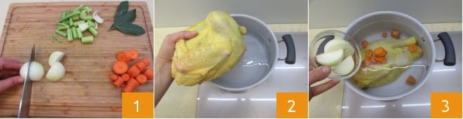 Pour préparer les raviolis avec bouillon de chapon, commencez par la préparation du bouillon. Prenez les carottes, épluchez-les et coupez-les en morceaux; après avoir nettoyé l'oignon, coupez-le également ainsi que le céleri en morceaux 1. Maintenant, prenez une casserole à fond antiadhésif et aux bords hauts : versez beaucoup d'eau et ajoutez le chapon nettoyé (et éventuellement flambé s'il présente trop de plumes). L'eau devra recouvrir totalement le chapon. Ajoutez également carottes et oignons 3.