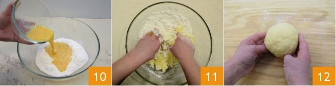 Cassez les œufs à température ambiante avec une fourchette et versez-les dans le bol 10 : pétrissez les ingrédients avec les mains 11, si vous préférez, vous pouvez utiliser une fourchette, jusqu'à obtenir un mélange homogène auquel vous donnerez une forme sphérique 12. La pâte devra être suffisamment élastique : si elle est trop dure et difficile à travailler, vous pouvez ajouter un peu d'eau tiède ; si elle est trop collante, ajoutez de la farine, sans exagérer pour ne pas obtenir l'effet contraire. Enveloppez la pâte obtenue dans un film alimentaire transparent et laissez-la reposer à température ambiante à l'abri des courants d'air, pendant au moins 30 minutes.