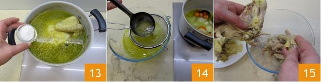 À ce stade, le chapon sera presque cuit : à dix minutes de la fin de la cuisson, ajustez le sel 13. L'ajout du sel en fin de cuisson vous permettra de mieux ajuster la sapidité du bouillon. Une fois que vous aurez terminé la cuisson du bouillon, filtrez-le avec une passoire fine 14 et réservez. Prenez le chapon et désossez-le 15.
