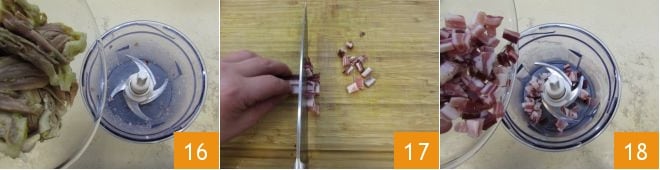 Mettez la viande dans un mixeur et mixez-la 16. Prenez la pancetta fumée, coupez-la en lanières puis en cubes 17 que vous verserez dans le mixeur et mixerez 18.
