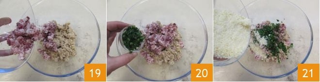Mettez le chapon et la pancetta mixés dans un grand bol 19, en assaisonnant avec du persil finement haché 20. Ajoutez le fromage râpé 21.