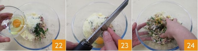 Versez également les œufs dans le bol 22 et assaisonnez avec la noix de muscade 23 : pétrissez les ingrédients avec les mains 24 jusqu'à obtenir un mélange homogène. Réservez le mélange pendant que vous préparez la feuille pour les raviolis.