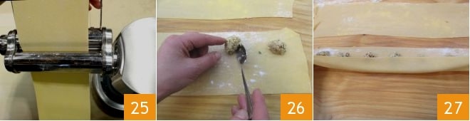 Reprenez la pâte que vous avez laissée reposer et divisez-la en deux. Saupoudrez légèrement un morceau (vous pouvez couvrir l'autre avec un film plastique pour qu'il ne sèche pas) avec la semoule de blé dur et étalez-le avec le rouleau à pâtisserie ou en vous aidant de la machine à pâte 25 : passez-le entre les rouleaux de l'épaisseur la plus large jusqu'à l'avant-dernier réglage de la machine à pâte pour obtenir des rectangles d'environ un demi-centimètre d'épaisseur. La largeur de la feuille devra être de 8 cm. Répétez ces opérations également pour le second morceau. Disposez les feuilles sur une surface de travail légèrement farinée avec de la semoule de blé dur et placez la farce divisée en petites boules en vous aidant d'une cuillère à café 26. Disposez-les bien espacées sur la feuille environ 3 cm l'une de l'autre afin de pouvoir la refermer ensuite. Maintenant, refermez la feuille de pâte dans le sens de la longueur de manière à couvrir totalement la farce et faire correspondre les bords longs 27.