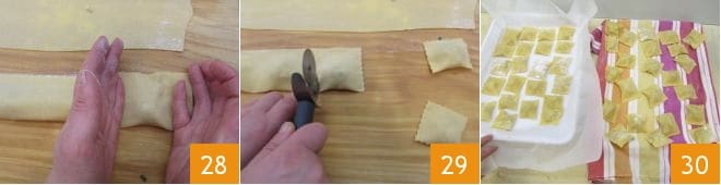 Avec les doigts, exercez une pression entre les petits tas de pâte de manière à faire sortir l'air et faire adhérer la pâte 28. À ce stade, découpez les tortelli avec une roulette crantée 29 : ils devront avoir la taille de 4x4 cm. Au fur et à mesure que vous les produisez, disposez-les sur un plateau recouvert d'un torchon propre légèrement fariné avec de la semoule de blé dur 30 : vous obtiendrez environ 80 raviolis.
