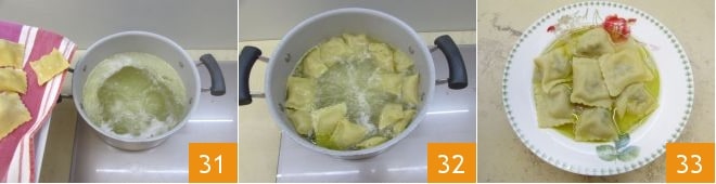 Versez le bouillon que vous avez filtré dans une casserole aux bords hauts et chauffez. Lorsqu'il sera bouillant, versez les raviolis 31, quelques-uns à la fois pour les cuire : environ 3 minutes suffiront 32. Lorsqu'ils seront cuits, dressez vos raviolis avec bouillon de chapon dans les assiettes individuelles et savourez encore fumants 33 !