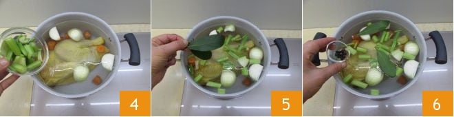 Puis versez également le céleri 4, les feuilles de laurier 5 et les baies de genièvre 6.