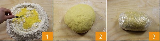 Pour réaliser les ravioli del plin, commencez par préparer les pâtes aux œufs selon les indications que vous trouvez Pâtes fraîches aux œufs (feuilletage et formats). Disposez la farine en fontaine sur le plan de travail, cassez-y un à un les œufs 1. En partant du centre, mélangez les œufs avec une cuillère; travaillez ensuite avec les mains ou avec une fourchette la pâte, en amalgamant toute la farine qui se trouve sur le plan de travail. Si la pâte ne collecte pas complètement la farine ou semble légèrement dure, ajoutez une ou deux cuillères à soupe d'eau tiède et continuez à pétrir jusqu'à ce qu'elle devienne lisse et compacte 2. Couvrez bien la pâte avec un film plastique 3 et laissez-la reposer dans un endroit frais et sec pendant 1 heure.