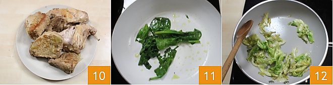 Lorsque les viandes sont cuites, retirez-les et laissez-les refroidir 10. Conservez les légumes à part avec le jus de cuisson qui servira à assaisonner les raviolis. Entre-temps, faites cuire séparément les épinards 11 et la scarole 12 à la poêle avec un filet d'huile jusqu'à ce qu'ils soient fanés (cela prendra environ 5 minutes). Si vous préférez, vous pouvez cuire épinards et scarole dans une seule poêle en prenant soin de cuire d'abord la scarole pendant quelques minutes et d'ajouter ensuite les épinards qui nécessitent moins de temps.