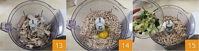 Entre-temps, désossez le lapin et coupez en morceaux la longe de porc et la chair de veau, mettez toutes les viandes dans un mixeur 13, broyez-les, ajoutez ensuite l'œuf 14, les légumes 15 et le fromage. Rectifiez le sel et le poivre et, si nécessaire, ajoutez un peu de bouillon.