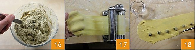 Mélangez tous les ingrédients jusqu'à obtenir une farce très dense et compacte 16. Maintenant, préparez les ravioli del plin: prenez une portion de pâte (en veillant à envelopper dans le film le reste de la pâte pour qu'elle ne sèche pas) et étalez la feuille fine 17, vous pouvez consulter la fiche Comment étaler la pâte de notre école de cuisine. Placez sur la moitié de la feuille inférieure une boule de farce d'environ 20 gr, en laissant un espace de 1-2 cm entre elles 18. Il est important de travailler la feuille rapidement pour éviter qu'elle ne durcisse.