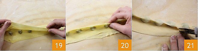 Repliez la pâte sur elle-même 19 dans le sens de la longueur et pincez avec les doigts les bords de pâte de chaque côté des boules de farce 20. Avec une roulette, coupez la pâte dans le sens de la longueur à quelques millimètres de la farce 21.