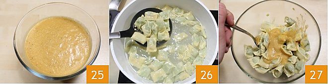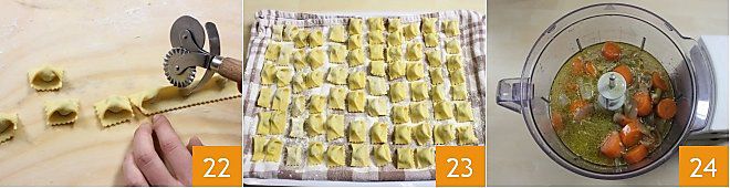 et puis séparez les raviolis 22 (ils doivent avoir une longueur d'environ 2 cm) en leur donnant une forme rectangulaire. Placez les ravioli del plin sur un plateau avec un torchon saupoudré de farine 23. Prenez maintenant les légumes mijotés précédemment, mettez-les dans un mixeur 24