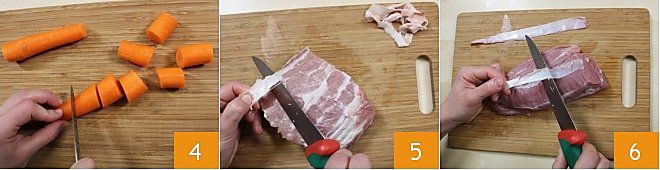 Coupez grossièrement les carottes 4, le céleri, l'oignon et réservez-les. Éliminez la partie grasse de la longe 5 et de la chair de veau 6; vous pouvez alternativement demander au boucher de nettoyer la viande en éliminant les parties grasses.
