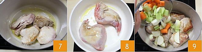 Dans une grande casserole, faites chauffer quelques cuillères d'huile et faites rissoler la longe de porc et la chair de veau 7 jusqu'à ce qu'elles soient bien dorées. Dans une autre poêle, faites également rissoler les cuisses de lapin avec deux cuillères d'huile 8. Lorsqu'elles sont bien rissolées, rassemblez toutes les viandes dans une seule casserole et ajoutez également les carottes, le céleri et l'oignon 9. Salez, poivrez et ajoutez une louche de bouillon ou d'eau (pour la préparation du bouillon, vous pouvez consulter la fiche bouillon de légumes de l'école de cuisine), couvrez et laissez cuire pendant environ une heure. Si nécessaire, ajoutez du bouillon ou de l'eau pendant la cuisson.