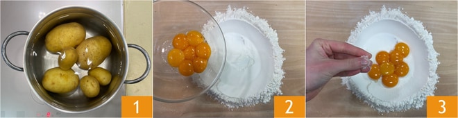 Pour préparer les raviolis de pommes de terre et oignon avec crème au fromage, commencez par cuire les pommes de terre dans de l'eau froide jusqu'à ce qu'elles soient tendres ; cela prendra environ 30-40 minutes, selon la taille. Pendant ce temps, préparez la pâte fraîche : disposez la farine en fontaine sur le plan de travail et versez les jaunes au centre 2, puis ajoutez une pincée de sel 3 et un peu d'eau.