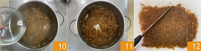 Lorsqu'ils auront pris de la couleur, déglacez avec de l'eau 10 et continuez à mélanger pour bien racler le fond. Continuez à cuire jusqu'à ce qu'ils soient bien tendres et caramélisés 11 ; cela prendra environ 10-15 minutes. Transférez les oignons caramélisés sur une planche à découper et hachez-les finement avec un couteau 12.