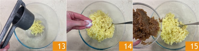 Entre-temps, les pommes de terre seront prêtes, alors passez-les au presse-purée et recueillez-les dans un grand bol 13. Salez 14, poivrez et ajoutez les oignons hachés 15.