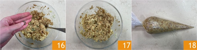 Parfumez avec les feuilles de thym 16 et mélangez le tout 17, puis transférez la préparation dans une poche à douille sans embout 18.