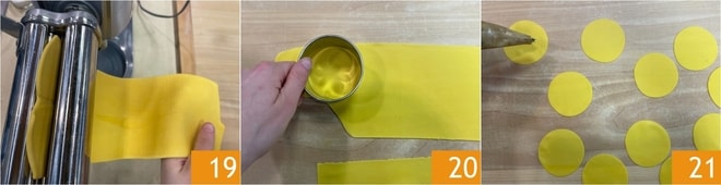 Reprenez maintenant la pâte, divisez-la en portions plus petites et étalez-la avec une machine à pâtes en commençant par l'épaisseur la plus large jusqu'à atteindre l'avant-dernière (environ 2 mm) 19. Faites quelques plis aux feuilles lors du passage d'un rouleau à l'autre pour donner plus de force à la pâte. Disposez les feuilles sur le plan de travail et découpez des disques avec un emporte-pièce de 7 cm de diamètre 20. Vous pouvez pétrir et étaler à nouveau les restes pour obtenir d'autres raviolis. Pressez une noix de garniture au centre de chaque disque 21, puis vaporisez-les avec un peu d'eau pour faciliter la fermeture.