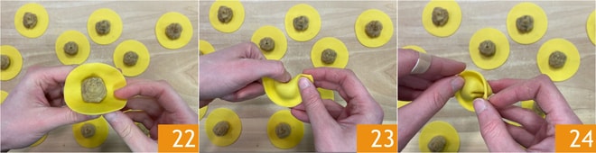 Repliez chaque disque en deux pour former un demi-cercle 22, puis pressez bien les bords pour sceller la fermeture, en prenant soin de faire sortir tout l'air. Enfin, fermez le ravioli en poussant délicatement avec le pouce vers l'intérieur 23 et en pinçant ensemble les extrémités 24. Procédez ainsi pour former tous les raviolis ; avec ces quantités, vous en obtiendrez environ cinquante.