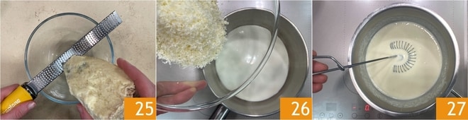 À ce stade, préparez la fondue : râpez le castelmagno 25. Dans une casserole, versez la crème et le fromage râpé 26, puis chauffez à feu très doux pendant une dizaine de minutes jusqu'à ce qu'il soit fondu, en remuant de temps en temps avec un petit fouet 27.