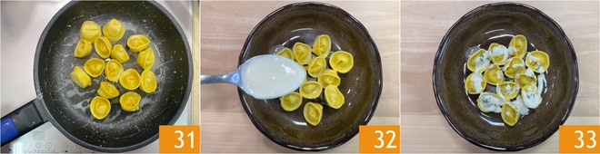 Vous êtes prêt pour la cuisson : portez à ébullition une casserole d'eau salée, plongez quelques raviolis à la fois 28 et faites-les cuire pendant 2-3 minutes. Égouttez les raviolis dans une poêle, puis ajoutez une louche de leur eau de cuisson 29 et le beurre 30.