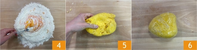 Commencez à incorporer la farine en battant les œufs avec une fourchette 4, puis aidez-vous d'une raclette et enfin travaillez avec les mains jusqu'à obtenir une pâte compacte, lisse et homogène 5. Enveloppez le pâton dans du film plastique et laissez reposer au réfrigérateur pendant au moins 20 minutes 6.
