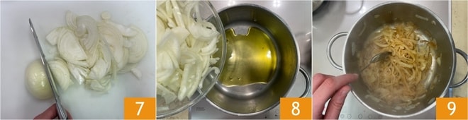 En attendant, occupez-vous de la garniture : épluchez les oignons et coupez-les en julienne 7, puis mettez-les dans une casserole où vous avez fait chauffer un filet d'huile 8. Faites revenir à feu vif en remuant souvent 9.