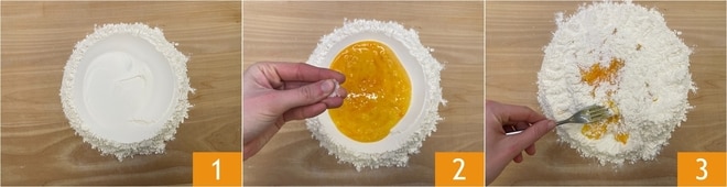 Pour préparer les raviolis de poisson avec sauce au safran, commencez par les pâtes fraîches : placez la farine en fontaine sur le plan de travail 1 et versez les jaunes au centre, puis ajoutez une pincée de sel 2 et un peu d'eau. Commencez à incorporer la farine en battant les œufs avec une fourchette 3, puis aidez-vous d'une raclette.