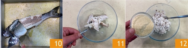 Une fois le temps de cuisson du poisson écoulé, levez les filets de bar en retirant la peau et les arêtes 10. Réservez le jus de cuisson du poisson, puis transférez les filets dans un bol 11 et ajoutez la chapelure 12.