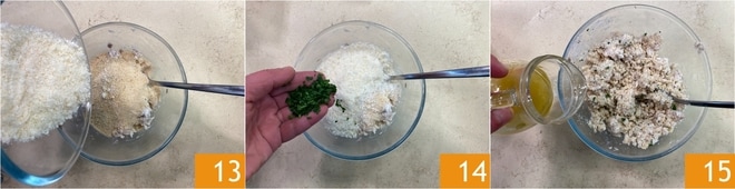 Ajoutez également le fromage râpé 13 et le persil haché 14, puis mélangez. Versez un peu de jus de cuisson du poisson 15.