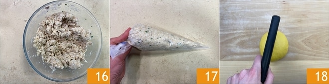 Mélangez et ajustez la quantité de liquide en fonction de la consistance du mélange, qui doit être moelleuse mais pas trop compacte 16. Transférez la farce dans une poche à douille sans embout 17. Maintenant, reprenez la pâte et divisez-la en portions plus petites avec une raclette 18.