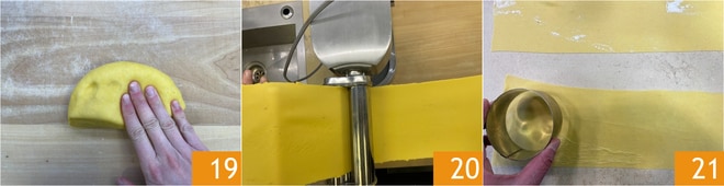 Aplatissez la première portion 19 et gardez les autres enveloppées dans le film pour éviter qu'elles ne sèchent. Étalez la pâte à l'aide d'une machine à pâtes en partant de l'épaisseur la plus large 20 jusqu'à l'avant-dernier cran (environ 2 mm). Disposez les feuilles sur le plan de travail et découpez des disques avec un emporte-pièce de 7 cm de diamètre 21. Vous pouvez pétrir et étaler à nouveau les chutes.