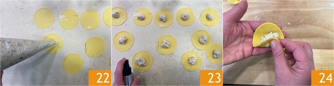 Pressez une noix de farce au centre de chaque disque 22, puis vaporisez les bords avec un peu d'eau pour faciliter la fermeture 23. Pliez chaque disque en deux pour former un croissant 24 et appuyez bien sur les bords pour sceller la fermeture.