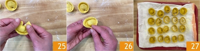 Rejoignez les extrémités en appuyant délicatement la partie avec la farce avec le pouce vers l'intérieur 25 et en les pinçant ensemble 26. Procédez de cette manière pour former tous les raviolis ; avec ces quantités, vous en obtiendrez environ une cinquantaine 27.