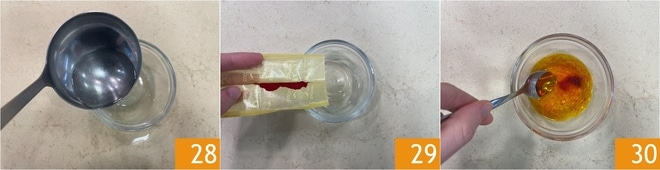Préparez la sauce au safran : dans un petit bol, versez une louche d'eau tiède 28, puis ajoutez le safran en poudre 29 et mélangez 30.