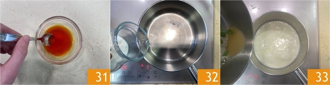 Une fois que le safran est complètement dissous, réservez 31. Dans une petite casserole, versez la crème fraîche 32 et faites-la chauffer à feu doux pendant environ 10 minutes pour qu'elle réduise, puis ajoutez le jus de cuisson du bar 33.