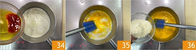 Ajoutez également le safran dissous 34, puis mélangez 35 et incorporez le fromage râpé 36. Mélangez encore, éteignez le feu et réservez la sauce.