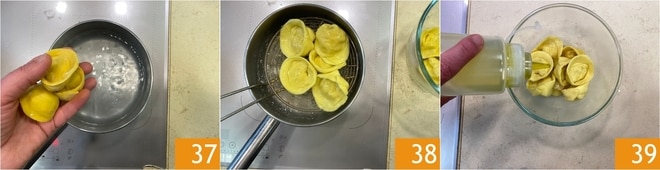 Portez à ébullition une casserole d'eau bouillante salée et faites cuire les raviolis pendant 2-3 minutes 37, puis égouttez-les 38 dans un bol et assaisonnez-les avec un filet d'huile d'olive 39.