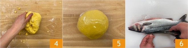 Enfin, travaillez avec les mains 4 jusqu'à obtenir une pâte compacte, lisse et homogène. Enveloppez la boule de pâte dans du film plastique 5 et laissez reposer au réfrigérateur pendant au moins 20 minutes. Pendant ce temps, prenez le bar déjà vidé et coupez les nageoires 6.