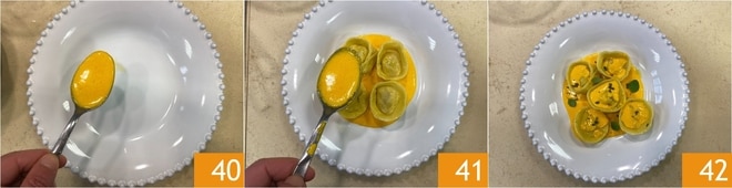 Dressez en répartissant une petite partie de la sauce au fond 20, puis disposez les raviolis et assaisonnez avec plus de sauce dessus 41, puis garnissez avec des feuilles de marjolaine. Vos raviolis de poisson avec sauce au safran sont prêts à être servis 42 !