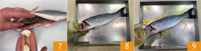 Farcissez le poisson avec les herbes aromatiques et les gousses d'ail 7, puis placez-le sur un plat, salez, poivrez et assaisonnez avec de l'huile 8. Arrosez le bar avec le bouillon de légumes 9 et le vin blanc, puis faites cuire dans un four préchauffé à 200° pendant environ 15-20 minutes.