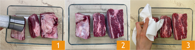 Pour préparer le ravioli farci de côtes de bœuf avec mousse de citron, commencez par la viande pour la farce : saupoudrez les côtes de bœuf de sel de tous les côtés 1, puis laissez-les reposer à découvert et à température ambiante pendant quelques heures 2. Une fois ce temps écoulé, tamponnez bien la viande avec du papier absorbant pour la sécher 3.