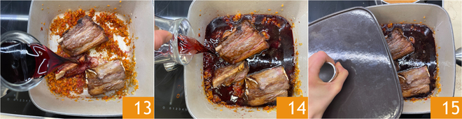 Maintenant, versez le vin rouge 13 et le Porto 14, puis poivrez et couvrez avec le couvercle 15. Transférez la casserole dans le four statique préchauffé à 160°C et faites cuire pendant au moins 2 heures et 30 minutes, ou jusqu'à ce que la viande soit très tendre.