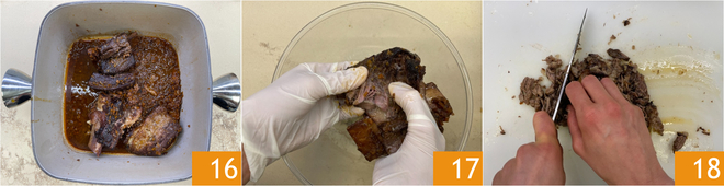 Une fois le temps de cuisson écoulé, laissez tiédir la viande dans la casserole 16. Effilochez la viande à la main en éliminant les os et le cartilage 17, puis hachez-la au couteau 18 et transférez-la dans un bol.