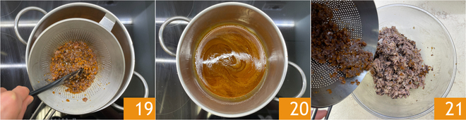 Filtrez le fond de cuisson dans une petite casserole 19 et réduisez-le à feu doux pendant environ 20 minutes 20 jusqu'à ce qu'il devienne environ la moitié. Entre-temps, ajoutez le reste du mélange passé au tamis à la viande dans le bol 21.