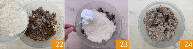 Ajoutez le Parmesan râpé 22 et le mascarpone 23. Mélangez bien pour bien amalgamer le tout 24, transférez dans une poche à douille sans embout et réservez au réfrigérateur.