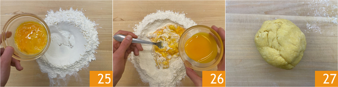 Disposez la farine en fontaine sur le plan de travail, puis versez au centre les œufs 25 et les jaunes 26. Incorporez la farine en mélangeant d'abord avec une fourchette, puis continuez à travailler sur le plan de travail pour obtenir une pâte lisse et homogène 27. Enveloppez la pâte dans un film alimentaire et laissez reposer à température ambiante pendant 30 minutes.